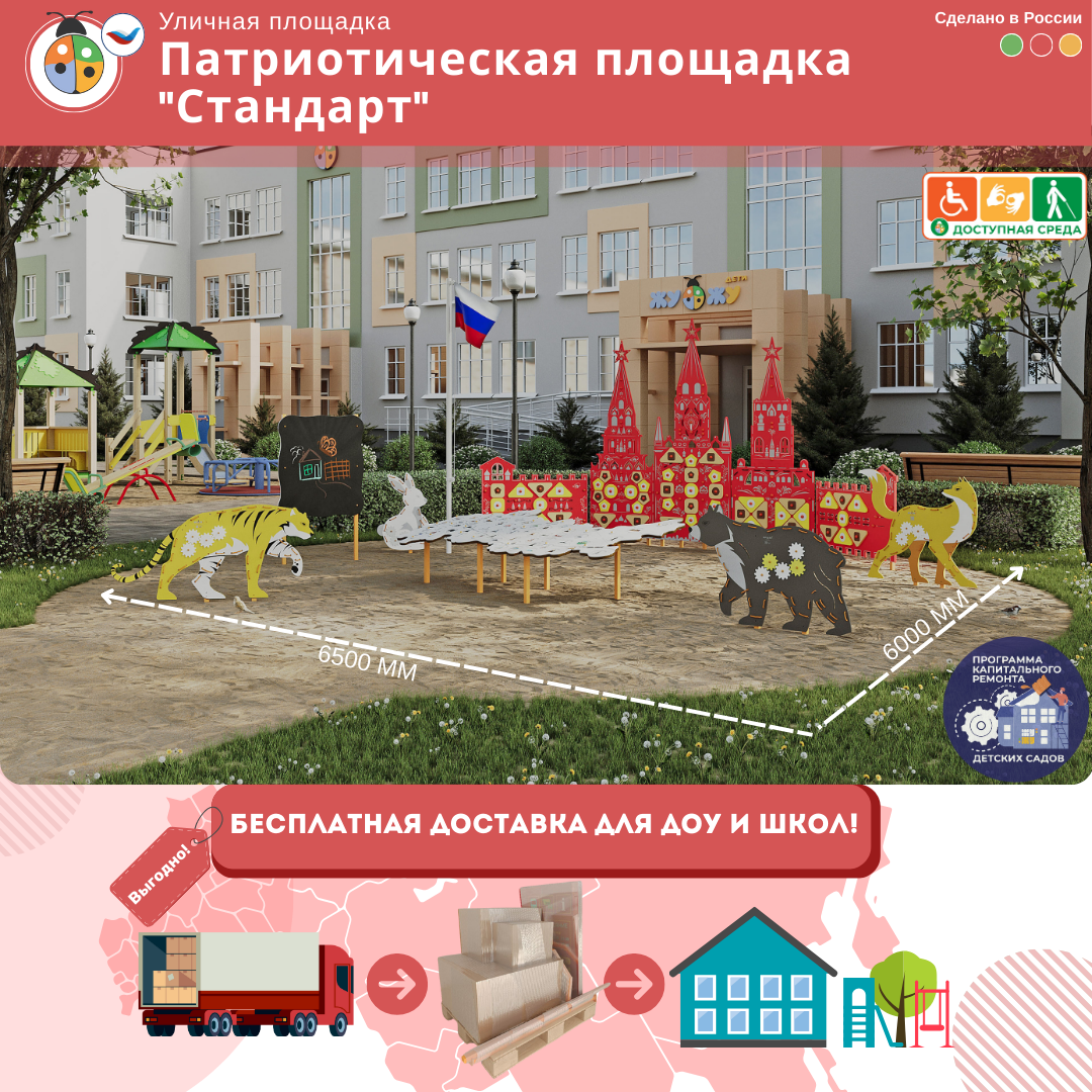 Патриотическая площадка ЖУ-ЖУ - это уличная площадка, формирует образовательную среду в учебном учреждении, а ее яркий дизайн украшает любую местность! Площадка позволяет проводить занятия по патриотическому воспитанию в игровом формате.Приобретая товар в Жу-Жу, вы получаете:
