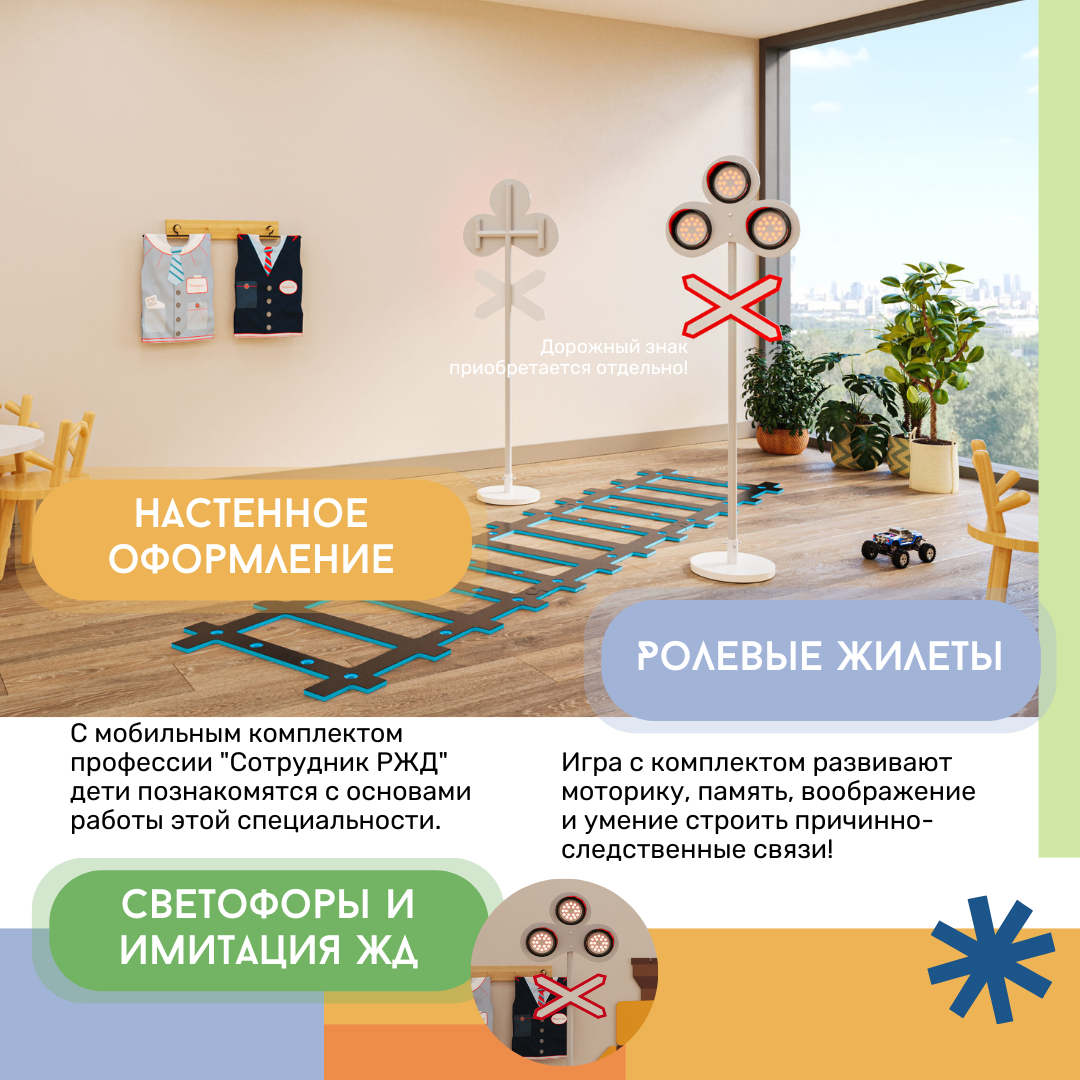 С мобильным комплектом профессии "Сотрудник РЖД" дети познакомятся с основами работы этой специальности. Игра с комплектом развивают моторику, память, воображение и умение строить причинно-следственные связи!