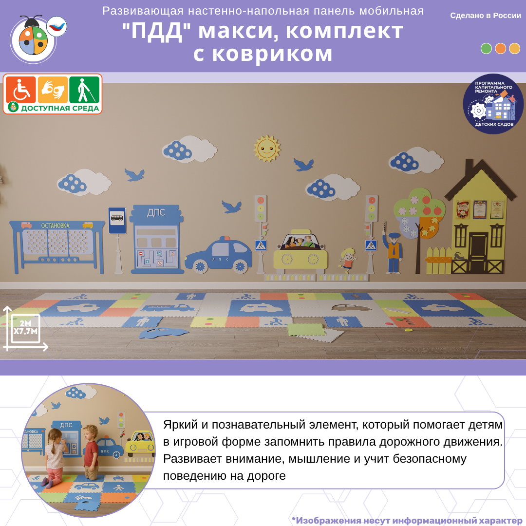Приобретая развивающую настенно-напольную панель мобильная "ПДД" макси, комплект с ковриком, вы получаете: