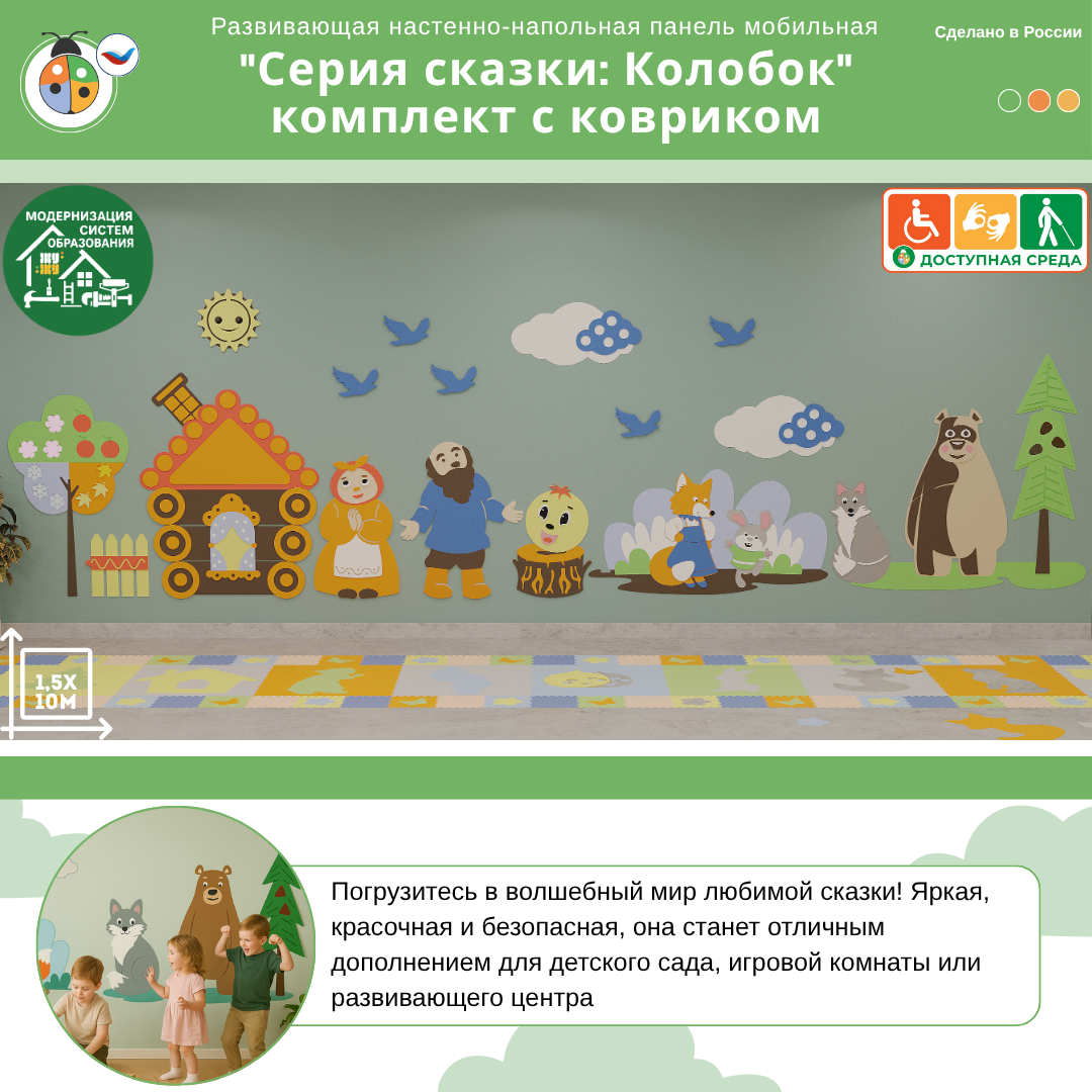 Развивающая настенно-напольная панель мобильная "Серия сказки: Колобок", комплект с ковриком