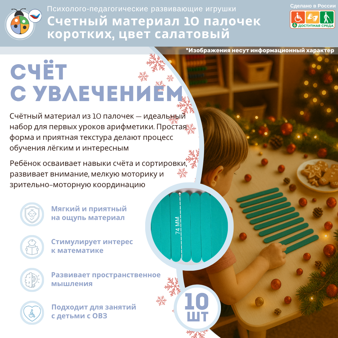 Счетный материал из 10 палочек коротких используется для обучения первичным навыкам счета. Элементы выполнены из эластичного, тактильно приятного материала.