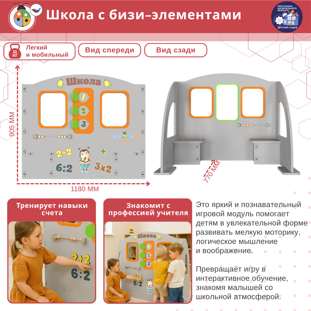 Макет школы с бизи-элементами идеально подходит для детских садов и развивающих центров, помогая малышам в игровой форме развивать мелкую моторику, логику и воображение. Скрытые картинки, счёты, магнитная доска, примеры делают его многофункциональной развивающей игрушкой, которая увлечет детей надолго.