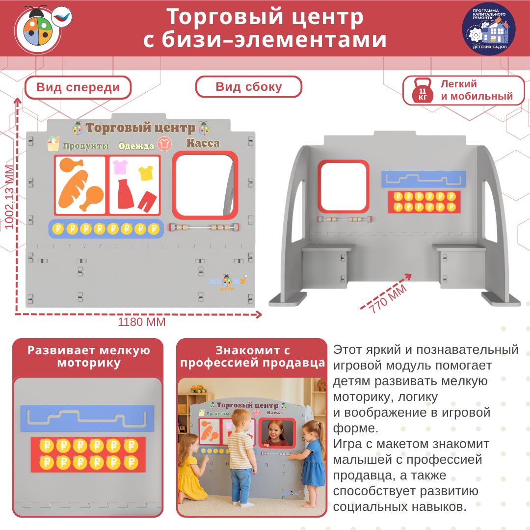 Макет торгового центра с бизи-элементами идеально подходит для детских садов и развивающих центров, помогая малышам в игровой форме развивать мелкую моторику, логику и воображение. Магнитные доски, съемные монетки, пальчиковый лабиринт, счеты делают его многофункциональной развивающей игрушкой, которая увлечет детей надолго.