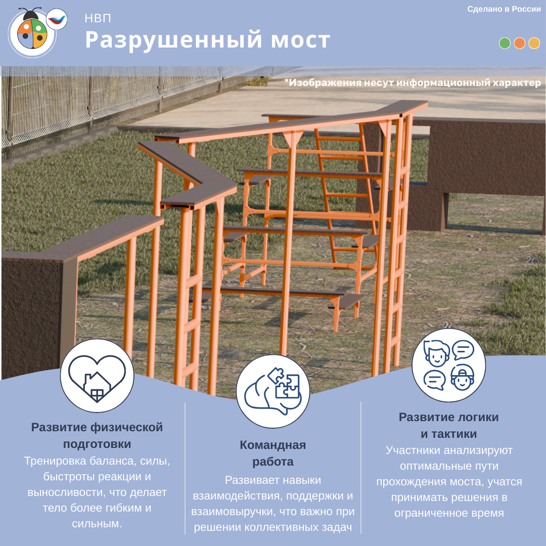 Уличное препятствие для НВП и ОБЖ "Разрушенный мост" — препятствие, задача которого состоит в том, чтобы забраться по лестнице и пройти до конца моста, перешагивая пустое пространство между частями моста.